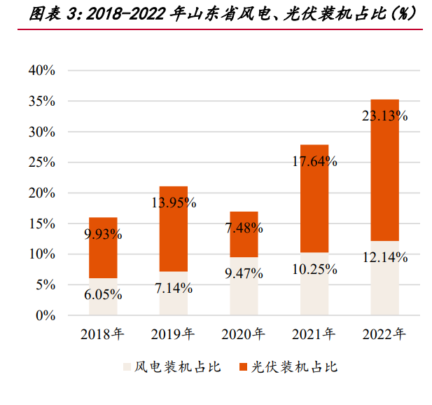 在新能源占比較高的地區,相應時段電價較低。由于新能源發電邊際成本低的特 質,在新能源高發期間,如果用電需求較低,則相應時段市場電價較低。以山東省電 力現貨市場為例: 2018-2022 年,山東省風電、光伏裝機容量及發電量持續增長,風電、光伏裝機 容量自 1146/1361 萬千瓦增長至 2302/4270 萬千瓦,CAGR 達 14.97%/25.69%,風電、 光伏裝機占總裝機量比例自 6.05%/9.93%擴張至 12.14%/23.13%;風電、光伏發電量 占總發電量比例自 2.32%/0.55%擴張至 5.28%/11.25%。