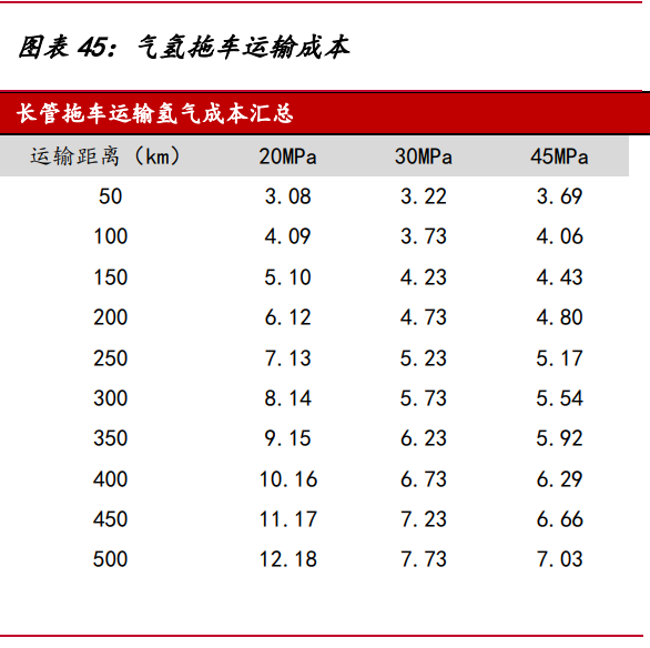 氣氫拖車是目前國內最成熟的氫氣運輸形式,我國氫氣管束式集裝箱和氫氣長管 拖車大多采用鋼制大容積無縫高壓氣瓶和鋼制內膽碳纖維環向纏繞氣瓶,工作壓力通 常為 20Mpa,單次運輸氫氣質量小,運輸效率低,適用于 200 公里以內的短距離運輸。 綜合市場上管束式氫氣集裝箱的平均輸氫量,假設 20/30/45MPa 管束式集裝箱最大可 運輸氫氣質量 340/650/950 千克,管束式集裝箱費用 60/70/80 萬,單位壓縮電耗 2/4.5/6kWh/kg,則運距 500 公里的運輸成本高達 7 元/kg 以上。