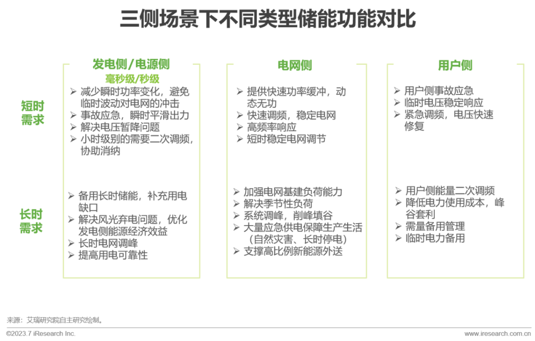 從電網角度來看,發電側、電網側和用戶側在不同時間維度下都存在不同痛點,以對應不同配儲的需求,從而實現電力系統長效、高經濟型發展。