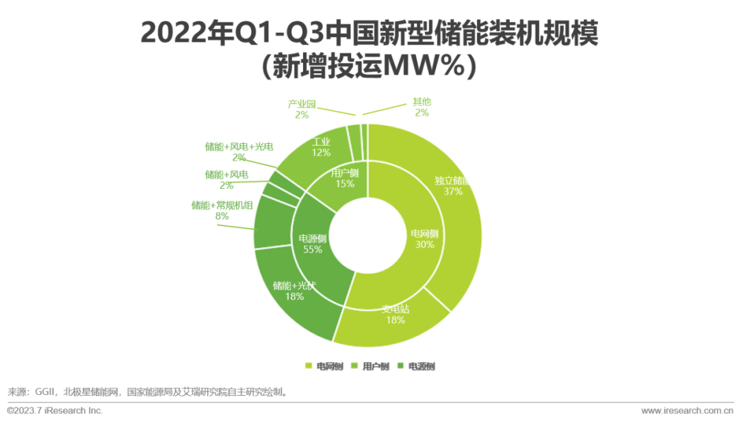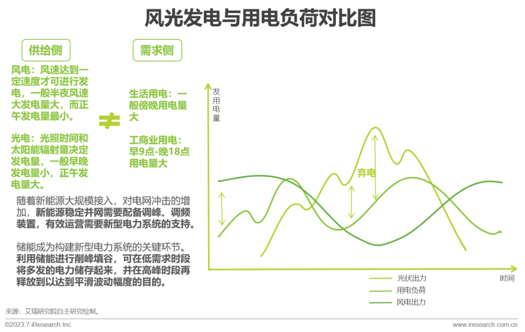 新型發電形式在電力市場裝機量中占比不斷增加,2022年我國風電、光伏發電量達到1.19萬億千瓦時,較2021年增加2073億千瓦時,同比增長21%,占全社會用電量的13.8%,同比提高2個百分點,接近全國城鄉居民生活用電量。同時電力基礎設備的老舊化已無法適應新型電力系統更綜合且龐大的電力結構。在風光發電模式的逐漸成熟化下,為提升整體電力系統可靠性,協調資源靈活使用、穩定消納,市場開始逐步催生配儲需求。