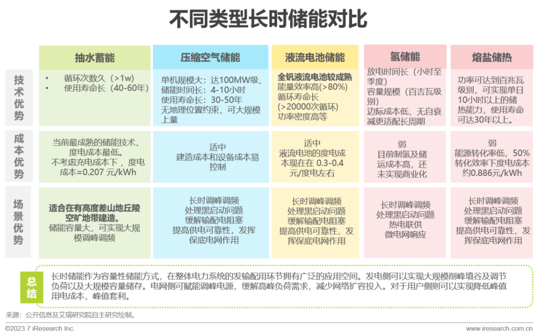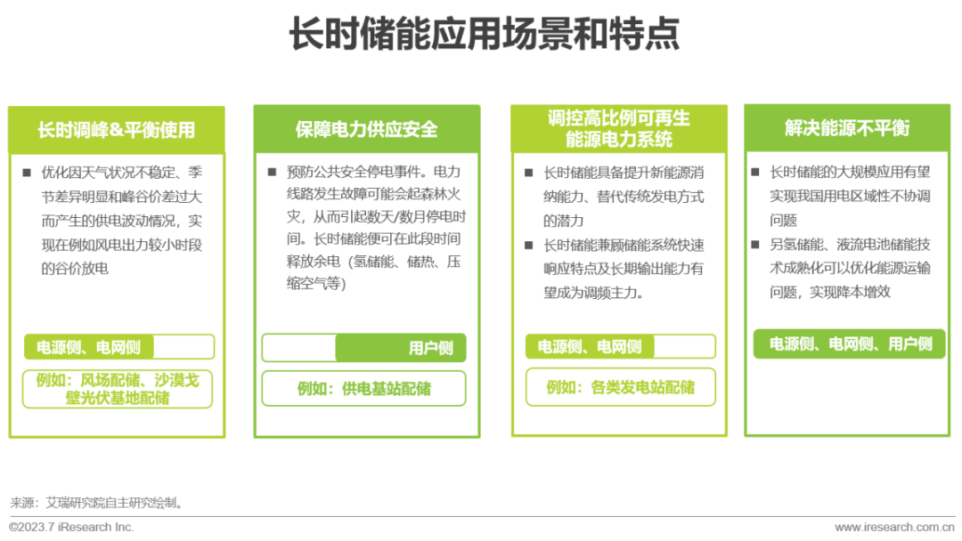 如果說短時儲能主要針對應急和小時級別調峰調頻需求。那么長時儲能會在可再生能源發電滲透率越高的場景下發揮更大發展潛力。風光電的占比越大,減少棄電、調頻調峰以及長時儲備的需求就越大。相較于短時儲能,長時儲能可以更好的實現電力平移,削峰填谷平衡電力系統、規模化儲存電力和保障電力穩定性。