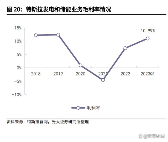 特斯拉發(fā)電和儲能業(yè)務營業(yè)收入除2019年外均穩(wěn)健增長,2020年到2022年增速均超過30%,發(fā)電和儲能業(yè)務毛利率在2019年-2021年有所下降,2022-2023第一季度明顯回升。在新能源大規(guī)模裝機和電網加大投資的背景下,家用級、商用級和公用級能源產品需求量不斷提升,儲能裝機量自2018年起逐年增加。2023年第一季度特斯拉該業(yè)務實現(xiàn)營業(yè)收入13.61億美元,同比增長148.21%,毛利率為10.99%。2023年4月,特斯拉宣布在中國上海新建儲能超級工廠(Megafactory),計劃于2024年第二季度投產,初期規(guī)劃公用儲能電池年產量達1萬臺,儲能規(guī)模近40GWh,和2022年相比產能直翻六倍多,儲能市場前景廣闊。