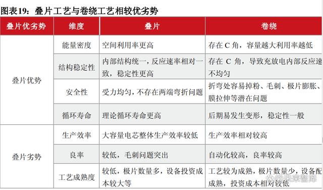 因此疊片工藝的電池理論上擁有更高體積能量密度上限、更穩(wěn)定的內(nèi)部結(jié)構(gòu)和更長的循環(huán)次數(shù)。全模切極耳數(shù)量變?yōu)閮杀叮山鉀Q電子電導(dǎo)的集流問題,提升電池快充性能。此外,疊片技術(shù)還可減少Pack零部件數(shù)量,提升電池集成度,有利于減少儲能系統(tǒng)占地面積和土建支出。