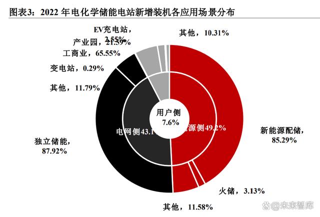 主要場景包括工商業(yè)、產(chǎn)業(yè)園、EV充電站、港口岸電、其他海島/校園/社區(qū)等。儲能裝置在用電低谷時(shí)充電,在用電高峰時(shí)放電,利用高峰和低谷的電價(jià)差,節(jié)省用電費(fèi)用,從中可獲取經(jīng)濟(jì)效益,因此戶用儲能主要集中在高電價(jià)及高電價(jià)差的國家或地區(qū)。國內(nèi)用戶側(cè)以工商業(yè)儲能(占比65.55%)為主,產(chǎn)業(yè)園儲能、EV充電站的占比也在逐漸提升,在新增裝機(jī)中占比21.59%、2.55%。
