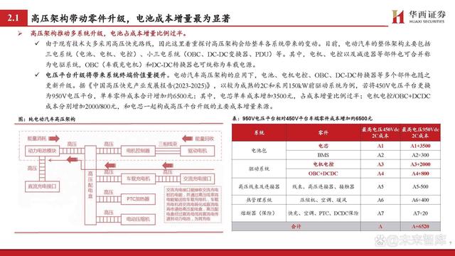 高壓架構推動多系統升級,電池占成本增量比例過半。 由于現有技術大多采用高壓快充路線,因此這里著重探討高壓架構會給整車各系統帶來的變動。目前,電動汽車的整體架構主要包括 三電系統(電池、電機、電控)、小三電系統(OBC、DC-DC變換器、PDU)等。其中,電機、電控以及減速器等部件也可合并稱 為電驅系統,OBC(車載充電機)和DC-DC轉換器也可統稱為車載電源。 電壓平臺升級將帶來系統終端價值量提升。電動汽車高壓架構的應用下,電池、電機電控、OBC、DC-DC轉換器等多個部件也隨之 更新升級。據《中國高壓快充產業發展報告(2023-2025)》,以較為成熟的2C和采用150kW前驅動系統為例,若將450V電壓平臺更換 為950V電壓平臺,單車零件成本合計增加約6500元;其中,電芯單車成本增加3500元,占成本增量比例過半;電機電控/OBC+DCDC 成本分別增加2000/800元,和電芯一起構成高壓平臺升級的主要成本增量來源。