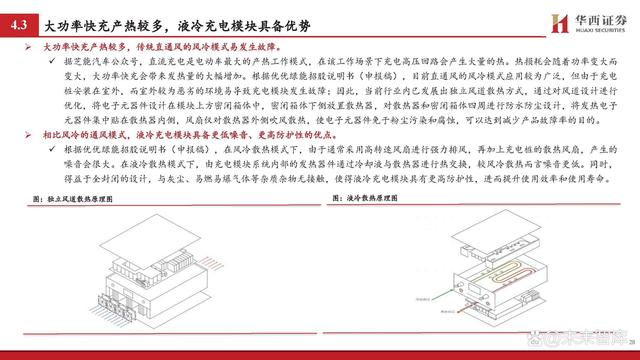大功率快充產熱較多,傳統直通風的風冷模式易發生故障。據芝能汽車公眾號,直流充電是電動車最大的產熱工作模式,在該工作場景下充電高壓回路會產生大量的熱。熱損耗會隨著功率變大而 變大,大功率快充會帶來發熱量的大幅增加。根據優優綠能招股說明書(申報稿),目前直通風的風冷模式應用較為廣泛,但由于充電 樁安裝在室外,而室外較為惡劣的環境易導致充電模塊發生故障;因此,當前行業內已發展出獨立風道散熱方式,通過對風道設計進行 優化,將電子元器件設計在模塊上方密閉箱體中,密閉箱體下側放置散熱器,對散熱器和密閉箱體四周進行防水防塵設計,將發熱電子 元器件集中貼在散熱器內側,風扇僅對散熱器外側吹風散熱,使電子元器件免于粉塵污染和腐蝕,可以達到減少產品故障率的目的。