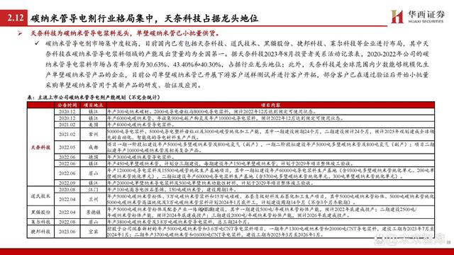 導電劑加速離子&電子移動速率,碳納米管較常規導電劑性能更優。除鋰電池主材外,導電劑作為鋰電池的材料構成中的關鍵輔材,同樣影響著鋰電池的倍率性能。據GGII,導電劑在活性物質之間、活性 物質與集流體之間起到收集微電流的作用,以減小電極的接觸電阻并加速電子的移動速率,同時也能有效提高鋰離子在電極材料中的遷 移速率,從而提高電極的充放電效率。 據GGII,目前市場上應用的鋰電池導電劑包括以炭黑、導電石墨為代表的常規導電劑和以碳納米管、石墨烯為代表的新型導電劑。據天 奈科技招股書,相較于常規導電劑的代表炭黑,碳納米管具有更好的導電性能,并能夠使鋰電池保持良好的電子和離子傳導;此外,碳 納米管憑借其較高長徑比的特性,相較于炭黑能夠進一步提高鋰電池的倍率性能。據GGII預計,在高倍率電池需求增加等因素的推動下, 新型導電劑將在未來幾年逐步替代傳統導電劑,其中碳納米管有望成為市場主流。此外,碳納米管一般分為單壁和多壁碳納米管,單壁 碳納米管因為長徑比更大,從而擁有更優的理化性能和導電性能,有望成為碳納米管未來的重點發展方向。