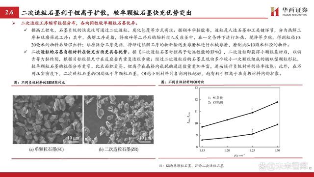 包覆材料通常為無定形碳,可改善鋰離子擴散性能。 除二次造粒外,包覆工序也可提升石墨材料快充性能。據翔豐華招股書,包覆碳化是指以石墨類碳材料作為“核芯”,在其表面包覆一 層均勻的無定形碳材料,形成類似“核-殼”結構的顆粒;通常用的無定形碳材料的前軀體有酚醛樹脂、瀝青、檸檬酸等低溫熱解碳材 料,由于無定形碳材料的層間距比石墨大,因此可改善鋰離子在其中的擴散性能,從而提高石墨材料的大電流充放電性能。 此外,為了避免瀝青等材料在碳化過程中可能出現的各向異性并進而影響倍率性能的問題,現有專利提出通過改性劑(酚醛樹脂、殼聚 糖、聚酰亞胺、聚酰胺或PET等)對基底材料(瀝青)進行改性(高溫攪拌混合等),而后對石墨進行包覆,此后在熱處理過程中便可 構筑具有各向同性的碳包覆層結構,從而進一步提升材料的快充性能。