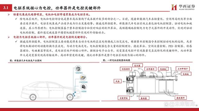 電控為電驅系統核心部件,功率器件則是電控的關鍵部分。 據威邁斯招股書,電機控制器主要功能是將來自動力電池的直流電轉換成三相交流電,根據整車控制指令來控制驅動電機的運轉,或者 將電機制動時的動能轉換為直流電,為動力電池充電。電機控制器包含大量的控制理論、濾波算法、空間矢量控制、PID 控制器、傳感 器理論、電磁兼容等技術,是電驅系統中的核心部件。據聯合電子公眾號,逆變器是電控中實現能量交直流轉化的關鍵部件,而功率器 件又是逆變器實現高傳輸效率、高功率密度的關鍵,因此功率器件是整個電驅系統較為核心的部件。