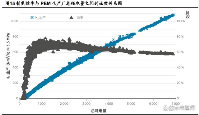 ALK 電解槽技術相對較為成熟,主要用于化工等非能源方面,而 PEM 電解槽的寬 廣工作范圍和更短的響應時間使得其在為電網(wǎng)提供輔助性服務方面具備相對優(yōu)勢。ALK 電解槽技術已經(jīng)完全成熟,自 20 世紀 20 年代以來已經(jīng)在工業(yè)中使用,主要用于非能源 相關的應用,特別是如氯氣制造等化學工業(yè)。目前 ALK 電解槽的使用壽命已經(jīng)提高一倍, 可以達到 10-20 年。與現(xiàn)有的 ALK 技術相比,領先的 PEM 電解裝臵在運行中的靈活性 和反應性更高。這種顯著提高的運營靈活性可以讓它從多個電力市場獲得收益,因為 PEM 技術提供更寬廣的工作范圍并且響應時間更短。 PEM 電解槽動態(tài)響應能力強,低負載下運行效率較高,增加的靈活性可能會提高 電力制氫的整體經(jīng)濟效益。質子交換膜(PEM)電解水技術在電壓多變的運行條件下, 表現(xiàn)出更好的靈活性,更快的響應性和 0-100%負荷范圍內的穩(wěn)定性,甚至可以短時間 高于額定負荷工作。堿性電解水技術從基礎機理層面來說不如質子交換膜(PEM)電解 水技術靈活。憑借向上和向下調節(jié)功能,PEM 電解槽可在不折損其可用生產(chǎn)能力的情況 下,提供高價值頻率控制備用容量(FCR),只要有足夠的氫存儲量,就可以在為其客 戶提供氫氣(用于工業(yè)、交通應用或天然氣管網(wǎng)的注入)的同時,以較低的額外 CAPEX 和OPEX為電網(wǎng)提供輔助性服務。這種增加靈活性可能會提高電力制氫的整體經(jīng)濟效益, 從而可以從多個電力市場形成新的收入來源,以補償 PEM 相對于 ALK 電解裝臵而言更 高的資本成本。