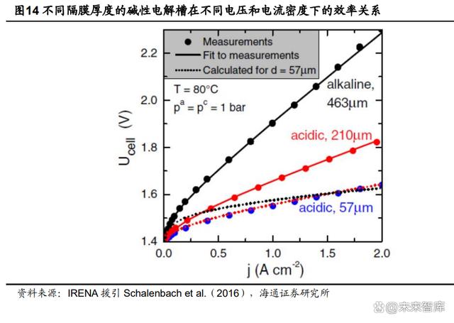 減小隔膜厚度:可以提高效率并減少電力消耗。隔膜越薄,將 OH-從陰極運輸 到陽極的阻力就越低,但由于氣體滲透水平較高,從而可能導致安全問題。另 一個缺點是耐久性較低,因為隔膜中更有可能會形成針孔,導致機械魯棒性降 低。總體而言,堿性電解槽的隔膜厚度應該接近 PEM 槽和 AEM 槽的水平。對 于 PEM 來說,目前最先進的膜厚度為 125-175 μm,并有潛力降低到 20 μm。 ALK 目前的隔膜厚度為 460 μm,將其降低到 50 μm 可以使堿槽在 1A/cm2 下 的效率從 53%提升到 75%。