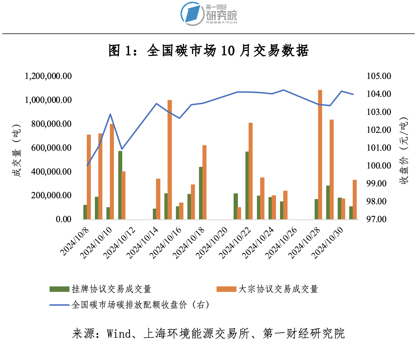10月全國碳市場碳排放配額(CEA)總成交量1324.58萬噸,總成交額12.96億元。掛牌協議交易月成交量410.08萬噸,月成交額4.20億元。大宗協議交易月成交量914.49萬噸,月成交額8.75億元。10月CEA最高價104.60元/噸,最低價99.73元/噸,10月最后一個交易日收盤價較9月最后一個交易日上漲4.55%。截至10月31日,CEA累計成交量4.94億噸,累計成交額297.17億元。