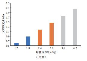 通過兩個方案進行燃料電池儲能經濟性評估,均按容量為1 MW 的燃料電池計算,運行周期為10 年,固定資產殘值為10%,用氫量為83.5 t/ 年。其中,方案A 為燃料電池發電,年利用小時數為2000 h,轉化效率為60%,發電量為200 萬kWh;方案B 為燃料電池熱電聯供,年利用小時數為3000 h,轉化效率為90%,發電量為300 萬kWh。兩種方案的不同綠氫成本對應的LCOE 如圖3 所示。