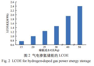 按1 臺容量為50 萬kW 的燃氣機組100%摻氫計算,燃氣電站投資單價為2600 元/kW,增加儲氣設施的投資為3000 萬元,年利用小時數為3000 h,運行周期為20 年,固定資產殘值為10%。按等熱值換算后的燒氫量為7 萬t/ 年,發電量為15 億kWh,計算得到不同綠氫成本對應的氣電摻氫儲能的LCOE,具體如圖2 所示。