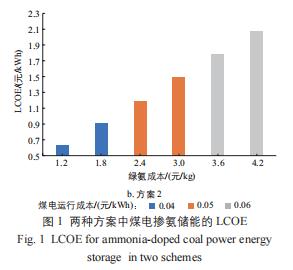 考慮煤電運行成本的影響( 煤電運行成本隨綠氨成本下降而下降),計算得到兩種方案中不同綠氨成本對應的煤電摻氨儲能的LCOE,具體如圖1 所示。